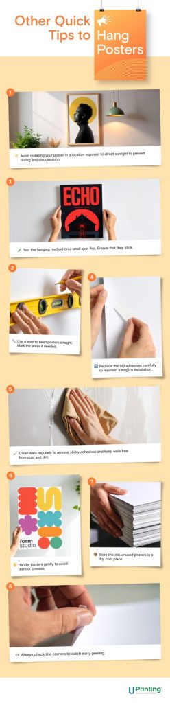 This method is great if you want a minimalist look without any visible hooks or nails. Plus, it lets you switch out your artwork quickly.