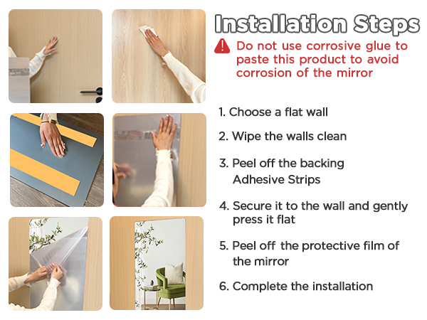 Never apply too much glue. Excess glue can drip and damage the wall or mirror. Avoid applying glue on the edges only; it reduces strength.