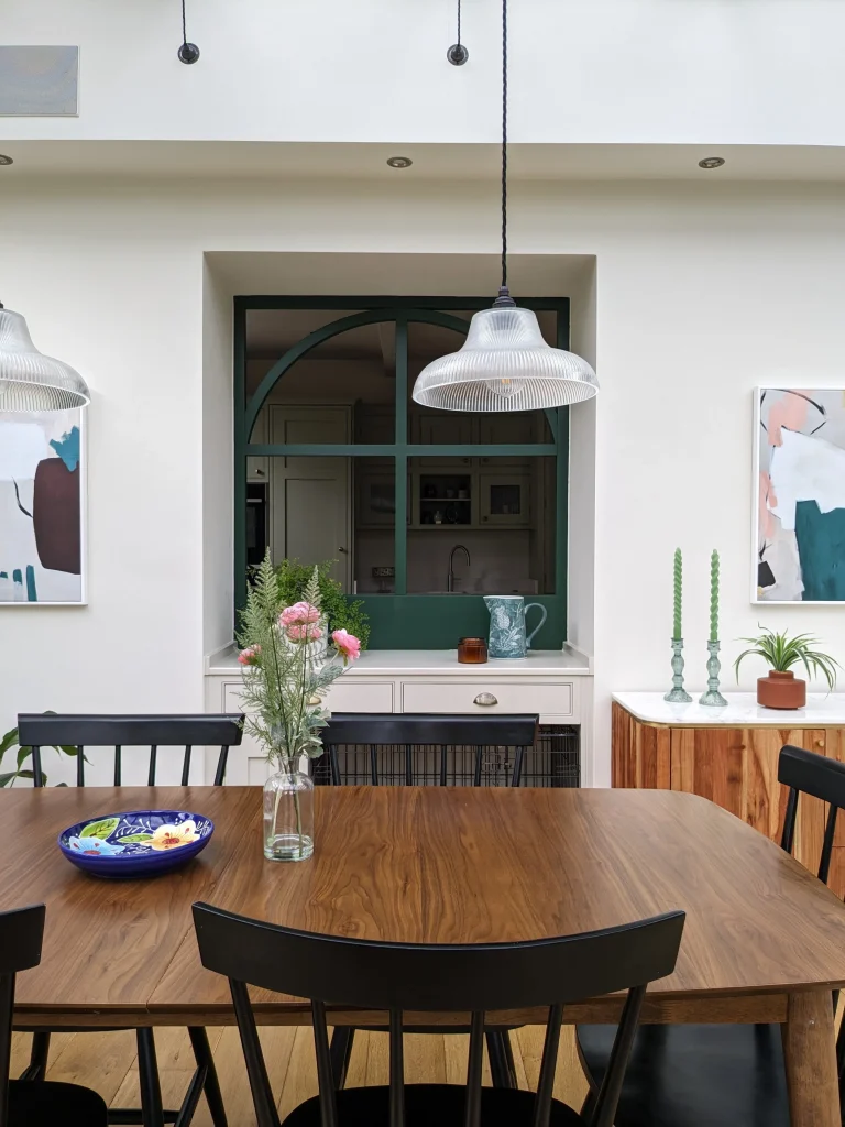 Space pendant lights 28 to 34 inches apart above dining tables. The goal is to light the table’s surface uniformly.