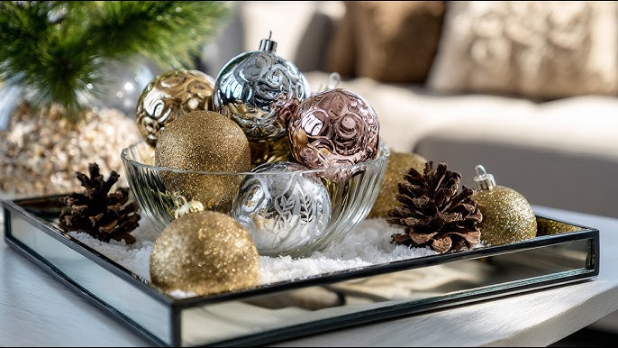 Create a centerpiece using pinecones, candles, and festive ornaments. Add greenery like pine branches for a natural touch. Use a decorative tray to arrange items neatly and enhance the holiday vibe.