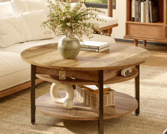 The material of your coffee table impacts its look and durability. Wood offers warmth and classic charm. Glass creates an airy, modern vibe. Metal adds a sleek, industrial feel. Finishes like matte, glossy, or distressed change the style further.