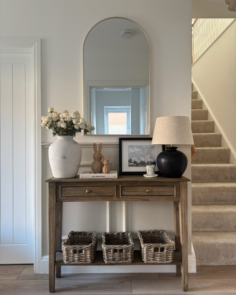 Think about the shape of the mirror in relation to your entryway table. Round mirrors soften sharp edges and add a friendly vibe, while rectangular or square mirrors emphasize clean lines and modernity.