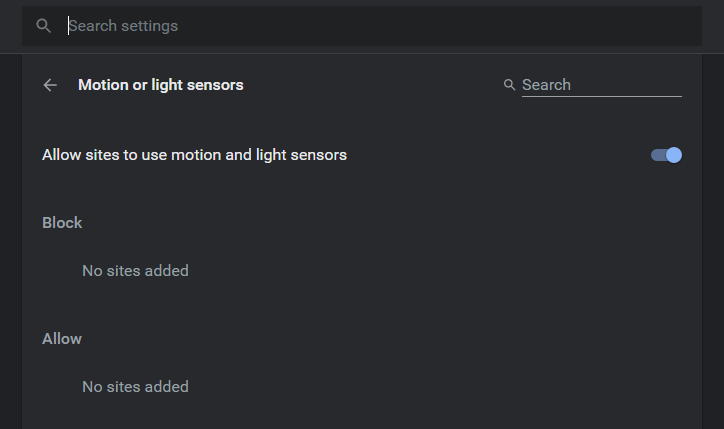 Chrome lets you control motion sensors on a site-by-site basis. You can allow trusted sites to use sensors while blocking others. Go to Chrome’s site settings and find “Motion Sensors.”