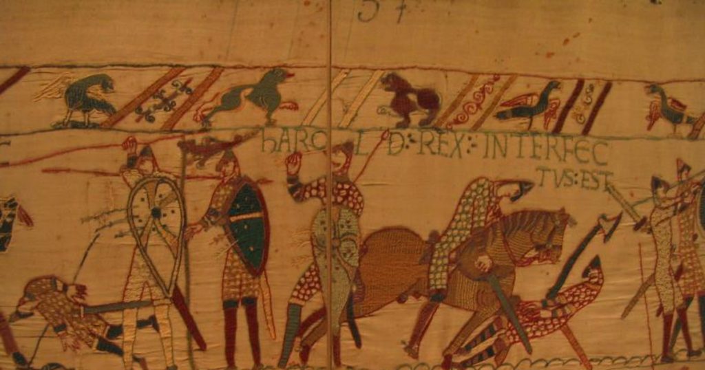 The tapestry’s language mixes Latin with hints of Norman French style, showing cultural blending.